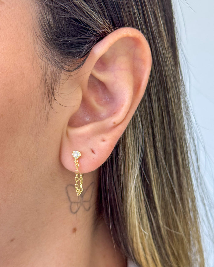 Estilo: brinco pequeno / delicado, com corrente e detalhe “ponto de luz” — minimalista, elegante e atemporal.