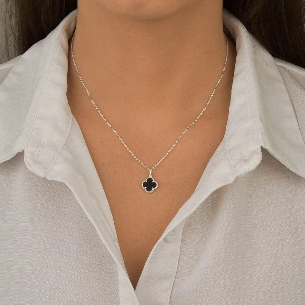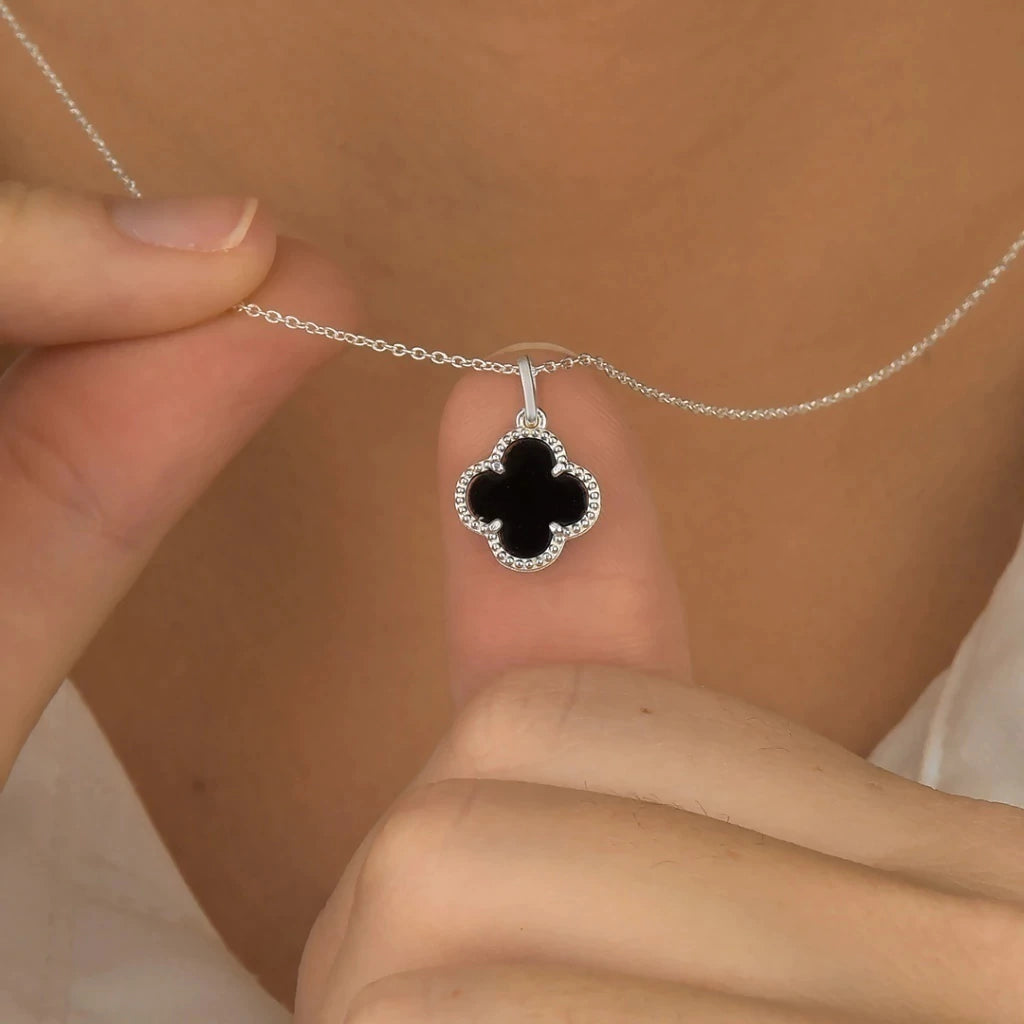 Look marcante — o contraste do trevo escuro com o metal da corrente traz um visual moderno, urbano e elegante.